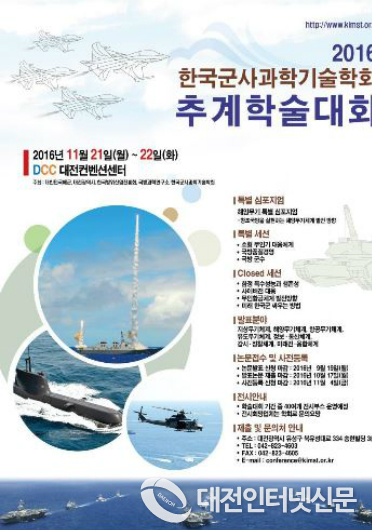 대전광역시(시장 권선택)는 해군, 한국군사과학기술학회, 국방과학연구소, 한국방위산업진흥회와 공동으로 2016 한국군사과학기술학회 추계학술대회를 11월 21일부터 22일까지 대전컨벤션센터에서 개최한다고 밝혔다.