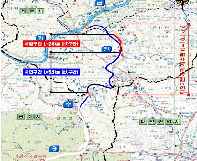 용수천 지방하천의 위치는 세종특별자치시 금남면 도암리 ~ 성강리 일원이며 사업량은 축제 및 호안정비 L=5.2km 교량 4개소, 보 2개소이고 총사업비는 21,992백만원〔공사비 12,975, 보상비 등 9,017〕공사기간은 `15. 10. 28. ~ `19. 12. 14.이다.