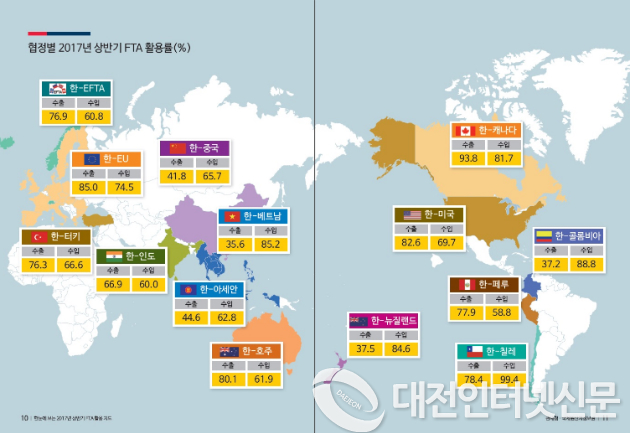 수출활용률은 캐나다(93.8%), EU(85.0%), 미국(82.6) 등이 높고, 수입활용률은 칠레(99.4%), 콜롬비아(88.8%), 베트남(85.2) 순으로 나타났다