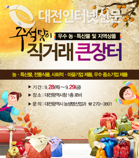 대전광역시(시장 권선택)는 우리 민족 고유의 명절인 추석을 맞아 9월 28일부터 29일까지 이틀간 시청1층 로비에서`추석맞이 우수 농․특산물 및 우리지역에서 생산하는 지역상품 직거래장터´를 개장한다고 밝혔다.
