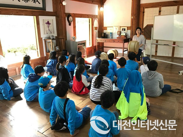 ▲ 고운초등학교는 12일(목) 4학년 학생 90명을 대상으로 우리나라 전통 음악인 `판소리´음악 수업을 진행하기 위해 공주 박동진 판소리전수관을 방문하여 체험학습을 실시했다. 사진은 학생들이 판소리에 대한 설명을 듣고 체험하는 장면 (사진-세종시교육청)