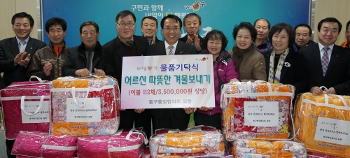 대전 동구통장협의회(회장 김경열)는 한현택 동구청장을 찾아 어려운 이웃을 위한 겨울 이불 112채(350만원 상당)을 “천사의 손길 행복+”에 기탁했다.