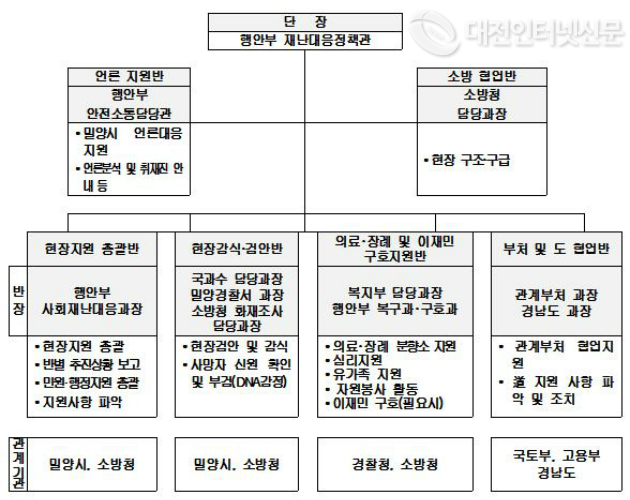 밀양시 재난안전대책본부(본부장:시장)는 재난현장 통합지원본부를 현장에 설치하여 현장민원실 운영, 유가족 구호, 자원봉사 지원 등 수습에 필요한 사항을 바로 지원하고 있으며 또한, 14개 병원에 분산(1.26 13시 기준)되어 치료를 받고 있는 부상자 지원을 위해 필요시 의료진을 추가 파견하고 병원별로 공무원을 배치하여 부상자 관리에도 최선을 다하고 있다.
