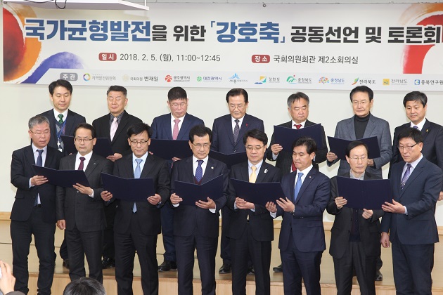 이날 토론회에 앞서 세종시를 비롯한 8개 시·도는 공동건의문 발표를 통해 헌법적 가치를 수호하고, 국토의 효율적 활용을 위해 상대적으로 낙후된 강원-충청-호남을 잇는 강호축을 개발해야한다고 강조했다.