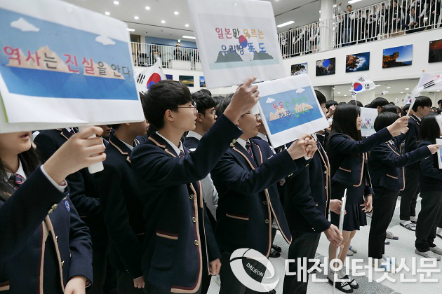 학생 대표의 성명발표로 시작된 이날 촉구 대회는 ▲전교생 항의 구호 낭독 ▲댄스 동아리의 독도 플래시몹 등 학생들이 주축이 되어 참여형 행사로 이뤄졌다.