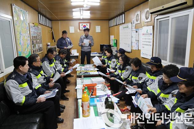 | ▲대전 중구 태평1동 기동순찰대 초소에서 자율방범대원 상대로 공직선거법 관련사례를 설명하며 선거법 위반 예방 교육을 실시(사진-대전청) |