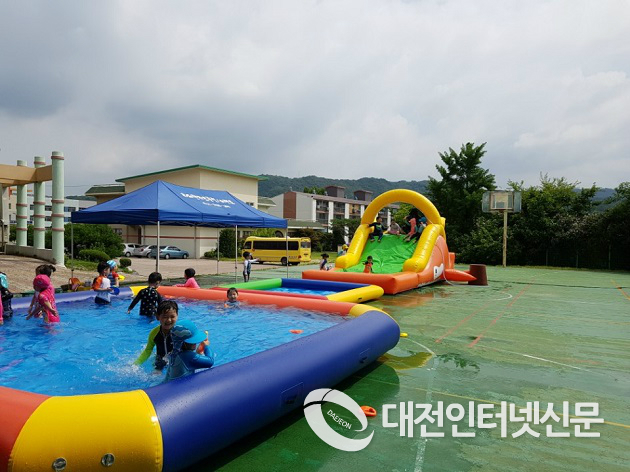 장마가 주춤하고, 30도를 밑도는 무더위가 찾아온 지난 4일 부강초병설유치원 앞에 워터파크가 떴다.