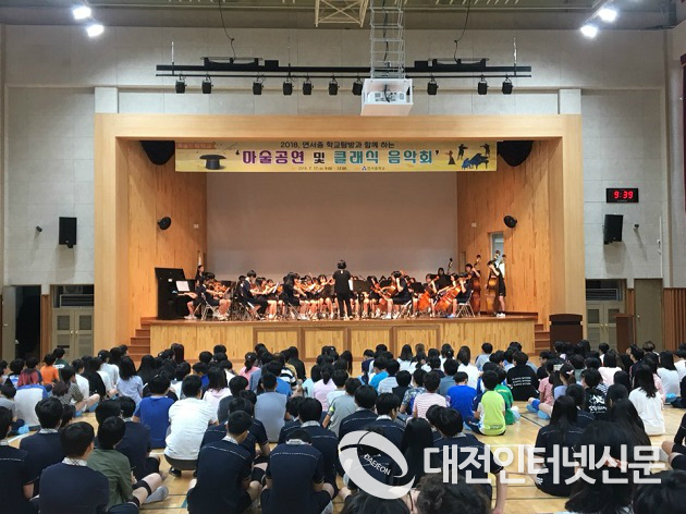 | ▲ 학생들이 연서중에서 준비한 연서오케스트라의 공연을 관람하고 있다.(세종시교육청제공) |