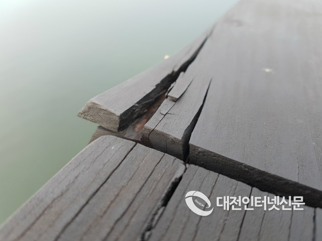▲ 보행대크 위로 돌출된 구조물로 혹여 아이들이 넘어질수 있지만 관리인력 부족으로 그대로 방치되고 있다. [사진-대전인터넷신문]