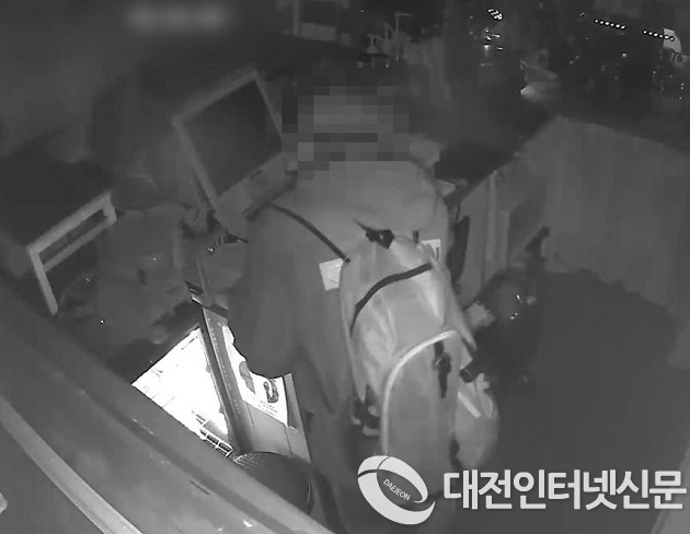 | ▲심야시간에 영업이 끝난 상가에 침입 카운터에 보관중인 현금 등을 훔치고 있다(사진-대전청) |