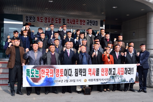 세종특별자치시의회(의장 유환준) 의원과 의회사무처 직원 등 40여명은 20일 11시 세종시의회 현관 앞에서 일본의 독도 영유권 도발 및 역사왜곡 망언 규탄대회를 가지고 성명서를 발표하였다.