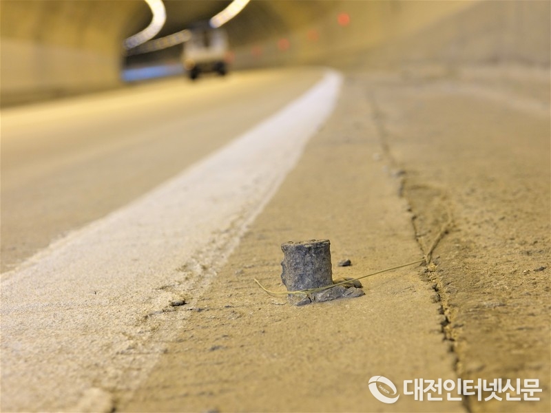 터널 내 차선을 식별하기 위해 설치된 도로표지병의 상판이 지나는 차량에 의해 파손되면서 하단 고정부의 철재파이프가 도로에 그대로 노출되어 운전자의 생명을 위협한 부강터널 전경. [사진-대전인터넷신문]