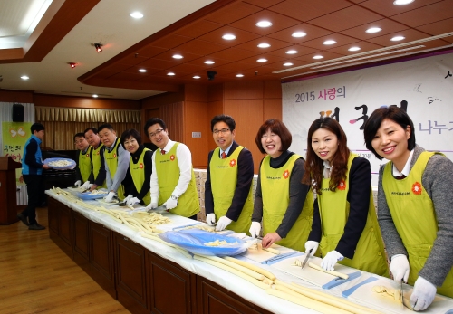 유성구는 16일 구청 대회의실에서 허태정 유성구청장과 직능단체, 대학생 자원봉사자, 지역주민 등 150여 명이 참석한 가운데 설 명절을 맞아 소중한 이웃에 전달할 사랑의 떡국떡 나누기 행사를 가졌다.