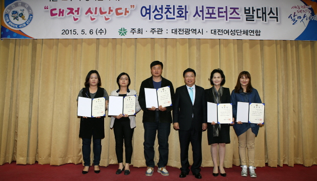 권선택 시장이 6일 구충남도청 회의실에서 열린 `여성친화 서포터즈 발대식´에 참석해 `성평등 도시, 행복하고 안전한 도시 대전` 손현수막을 들고 기념촬영을 하고 있다.