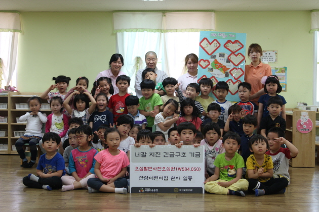 5월 22일 안암어린이집(원장 혜도스님)에서 40여명의 원생들이 모은 네팔 지진 피해기금 오십팔만사천오십원을 공익기부재단 아름다운동행(이사장 자승스님)에 전달했다.