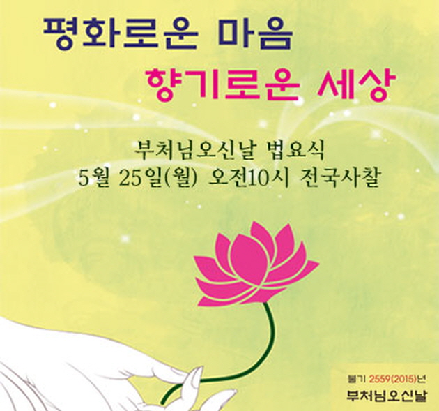 불기 2559(2015)년 부처님오신날 법요식이 오는 5월 25일(월) 오전 10시 서울 조계사를 비롯한 전국의 사찰에서 일제히 봉행된다.고 전했다