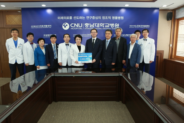 이날 추문진 회장은 충남대학교병원 회의실에서 메르스 환자 치료를 위해 헌신의 노력을 다 해주신 의료진들의 노력에 감사의 인사를 전하고 김봉옥 병원장에게 격려금을 전달하였다.