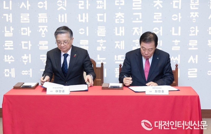 왼쪽부터 이한준 LH사장과 최민호 시장이 "행복도시 발전을 위한 상생협력 업무협약(MOU)" 에 사인을 하고 있다. [사진-세종시]