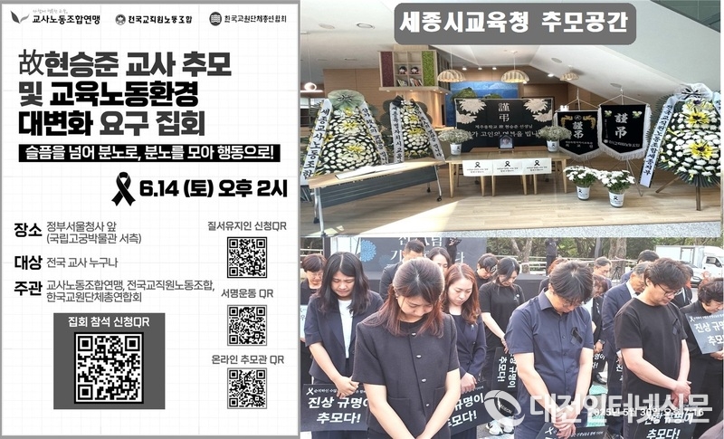 [대전인터넷신문=세종/최대열기자] 故 현승준 교사의 안타까운 사망 사건을 계기로 교육노동환경 개선을 요구하는 대규모 집회가 오는 6월 14일 서울에서 개최된다. 세종교사노동조합(세종교사노조)은 이번 집회에 통해 전국의 교사와 시민들에게 적극적인 참여를 촉구하고 나섰다.