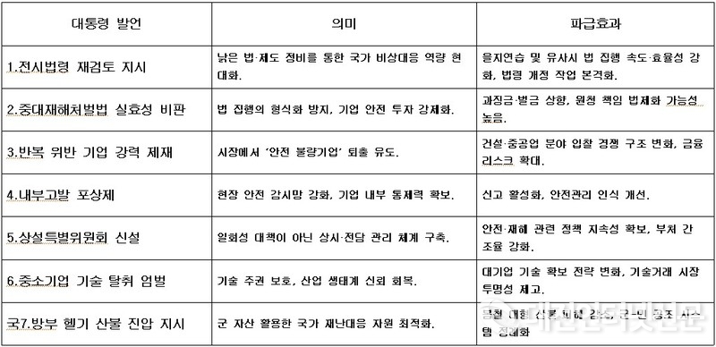 비공개로 진행된 부처 보고에서는 고용노동부의 ‘중대재해 감축을 위한 조치 대응’과 국토교통부의 ‘건설 중대재해 대응 방안’이 논의됐다. 이 대통령은 “대형 건설사들이 중대재해처벌법으로 처벌받은 사례가 단 한 건도 없다”라며 법 집행 실효성 부재를 지적했다. 이어 “기업이 안전 비용을 반드시 확보하도록 과징금 제도 도입을 검토하라”고 지시하며, 법 집행을 강화해 기업이 ‘벌금보다 안전비용이 더 싸다’는 계산을 못 하도록 하겠다는 대통령의 의지로 보인다.