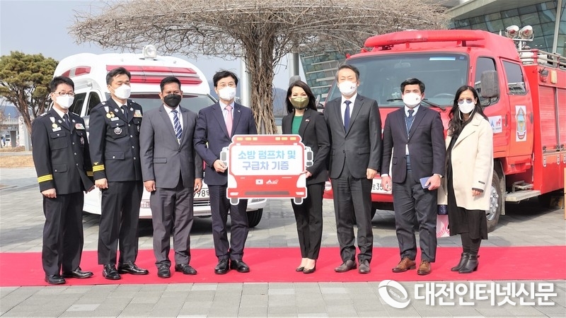 지난 2022년 2월 21일 공적 개발 원조 사업의 일환으로 캄보디아 바탐방 주에 세종시 소유 소방 차량 2대를 무상 지원하고 기념 촬영하는 모습[사진-대전인터넷신문]