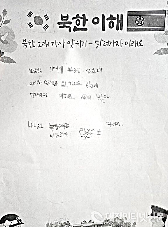 [대전인터넷신문=세종/최대열기자] 세종시의 한 중학교에서 도덕수업 시간에 학생들이 북한 선전가요 ‘달려가자 미래로’를 들으며 가사를 받아쓰는 수업이 이뤄진 사실이 알려지면서 논란이 전국적으로 확산되고 있다. 학부모단체는 “헌법정신에 반하는 위험한 교육”이라며 세종시교육청을 규탄했고, 교사단체는 “통일교육의 일환”이라고 반박했다.
