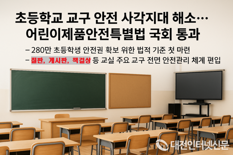 [대전인터넷신문=종합/최대열기자] 13일 국회 본회의에서 초등학교 교실 내 칠판·게시판 등 기존 법의 해석 공백으로 관리 대상에서 빠져 있던 교구를 어린이제품 안전관리 항목에 명확히 포함하는 「어린이제품안전특별법」 개정안이 통과되며, 전국 초등학생 280만 명의 안전한 학습 환경 조성을 위한 제도적 기반이 본격 마련됐다.