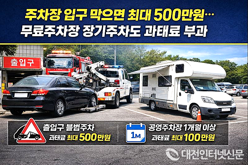 앞으로 주차장 입구를 막는 불법 주차를 할 경우 최대 500만 원 이하의 과태료가 부과되고, 무료 공영주차장에 정당한 사유 없이 1개월 이상 장기 주차하면 100만 원 이하의 과태료가 부과된다. [제작-대전인터넷신문]