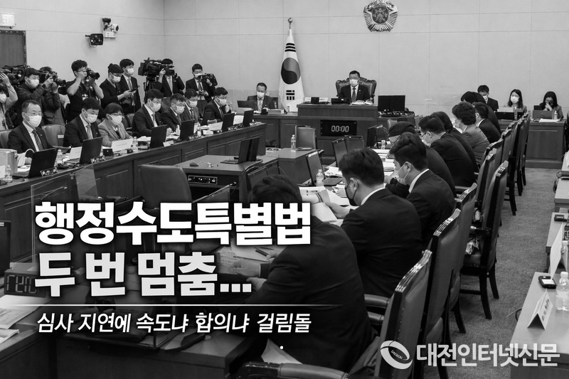 [대전인터넷신문=최대열기자] 행정수도건설특별법이 국회 국토교통위원회 법안심사소위원회에서 두 차례 연속 심의에 들어가지 못하면서 입법이 지연되는 가운데, 조속 처리를 요구하는 세종시를 비롯한 정치권의 목소리와 신중한 심사를 강조하는 입장이 맞서며 특별법 제정 여부와 향후 방향에 관심이 집중되고 있다.