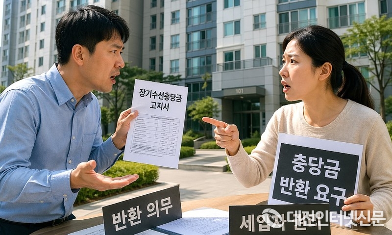 세입자와 임대인이 장기수선충당금 반환 문제를 두고 갈등을 벌이고 있는 모습을 시각화한 이미지. [그래픽-대전인터넷신문]