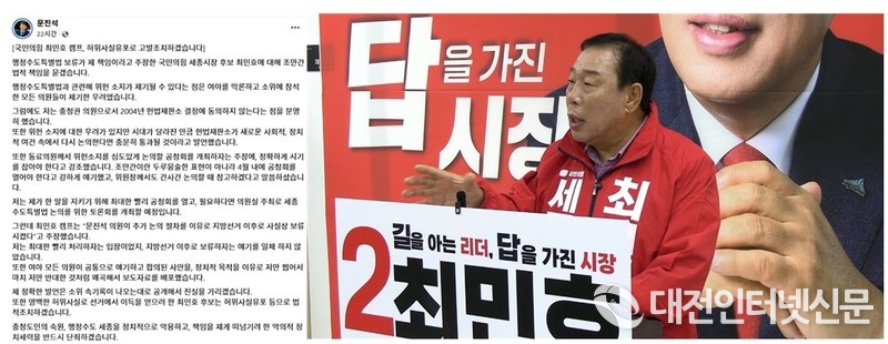 행정수도 건설 특별법이 국회 심사 단계에서 보류된 가운데 책임 소재를 둘러싸고 여야 간 공방이 격화되고 있다. 사진은 지난 22일 게시된 문진석 의원 페이스북과 지난 23일 열린 최민호 예비후보 기자회견 모습. [자료-문진석 의원 페이스북, 사진-대전인터넷신문]