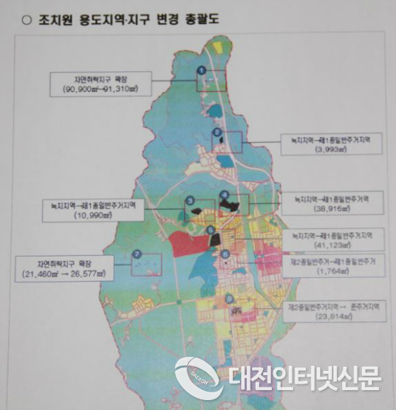 주요내용은 주거지역 152,713㎡ 증가, 녹지지역 160,079㎡ 감소, 농림지역 58,508㎡ 증가, 관리지역 세분 245,145㎡, 자연취락지구 변경 30개소 등 용도지역‧지구 변경에 관한 사항과 공원, 주차장, 공공청사 등 도시기반시설 109개소에 대해 변경 결정 고시하는 것이다.