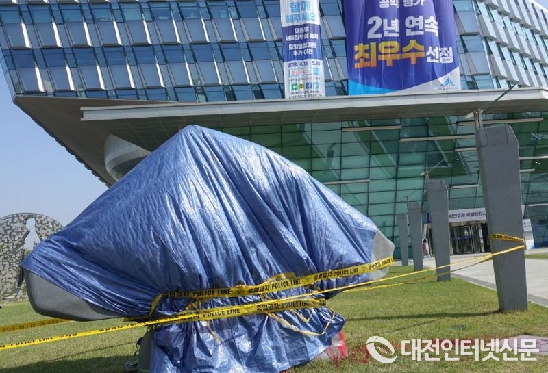 세종시 거주 20대 청년에 의해 박근혜 대통령의 친필 ‘세종시청’ 표지석이 천막에 덮여있는 모습과 옆으로는 붉은 페인트 흔적이 당시를 대변하고 있다. [사진-대전인터넷신문]