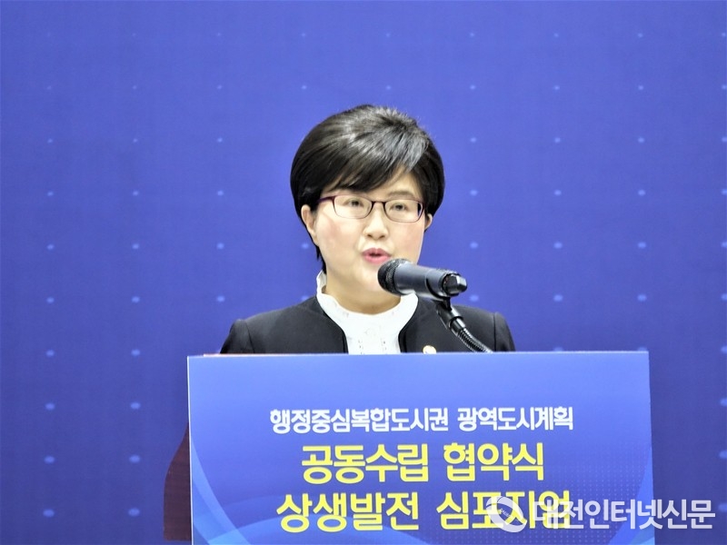 김진숙 행복청장이 인사말을 통해 특히 새로 만들어지는 통합된 광역도시계획이 각 지역의 풍부한 자원을 하나로 묶어 다함께 잘 사는 균형성장의 토대가 되고, 중부권을 대한민국의 새로운 중심으로 성장시키는 밑거름이 돼 줄 것으로 기대하며, 오늘 협약은광역적 발전체계를 구축하고 함께 이끌어 가자는 깊은 의미가 담긴 약속이자 다짐이라며, 중부권이동반 성장의 성공 모델이 될 수 있도록 오늘을 기점으로 더욱 긴밀히 협력하고 소통해 나갈 수 있기를 희망하고 있다. [사진-대전인터넷신문]