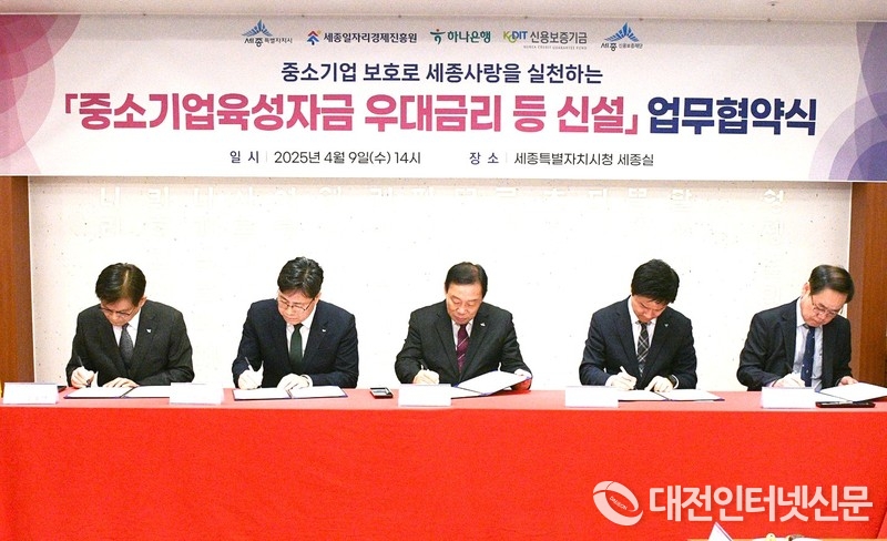시는 9일 시청 세종실에서 하나은행, 신용보증기금, 세종신용보증재단, 세종일자리경제진흥원과 ‘세종시 경영안정자금 우대금리 등 신설 업무협약’을 체결했다.