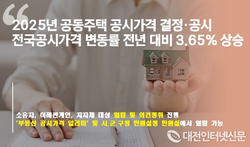 [대전인터넷신문=세종/최대열기자] 국토교통부(장관 박상우)는 ’25년 1월 1일 기준으로 조사ㆍ산정한 공동주택(약 1,558만 호)의 공시가격을 4월 30일(수) 공시한다.