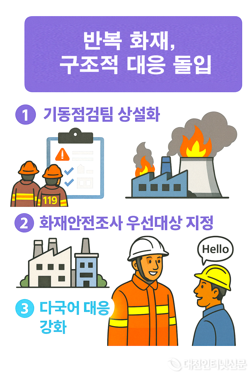 세종시 소방본부는 최근 잇따른 전의산업단지 내 화재 발생을 계기로, 동일 사업장에서 두 차례 이상 화재가 발생할 경우 해당 사업장을 ‘화재안전조사 우선 대상’으로 지정해 집중 관리하기로 했다. 이와 함께 반복 화재 지역을 상시 관리하는 기동 점검팀을 운영하고, 정기적인 행정지도와 표본 점검 방식으로 소방시설 운영 실태를 재확인할 방침이다.