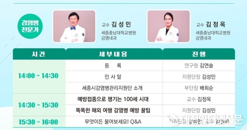 세종시, 감염병 전문가와 소통마당 개최 - 19일 조치원 행복누림터서 무료 진행, 시민 100명 선착순 모집 - 예방접종·해외여행 감염병 예방법 특강 및 질의응답 마련