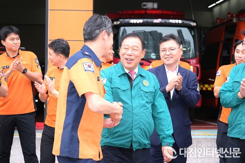 이어 남부소방서를 방문한 최 시장은 추석 연휴 기간 운영되는 119 안전대책을 청취하고 근무자들과 소통의 시간을 가졌다. 그는 “올해는 세종한글축제를 비롯해 다양한 행사가 열려 안전대책의 중요성이 더욱 크다”며 “여러분의 경험과 데이터를 활용해 사건·사고를 선제적으로 예방해 달라”고 주문했다.