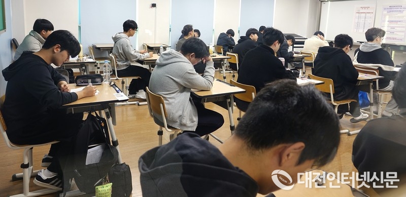 입실을 완료한 수험생들이 한문제라도 더 마추긱 위한 복습에 열중하는 모습. [사진-대전인터넷신문]