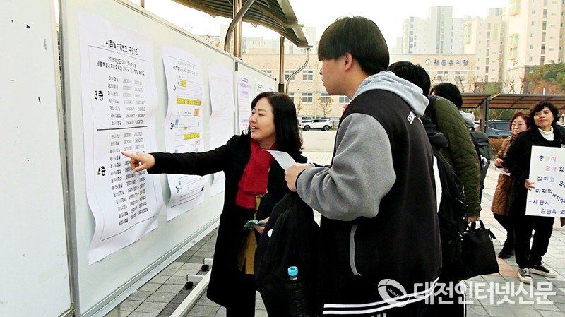 수험생들을 격려하고 있는 구연희 세종시교육감 권한대행(오른쪽)과 더불어민주당 김현옥 세종시의원(왼쪽). [사진-대전인터넷신문]