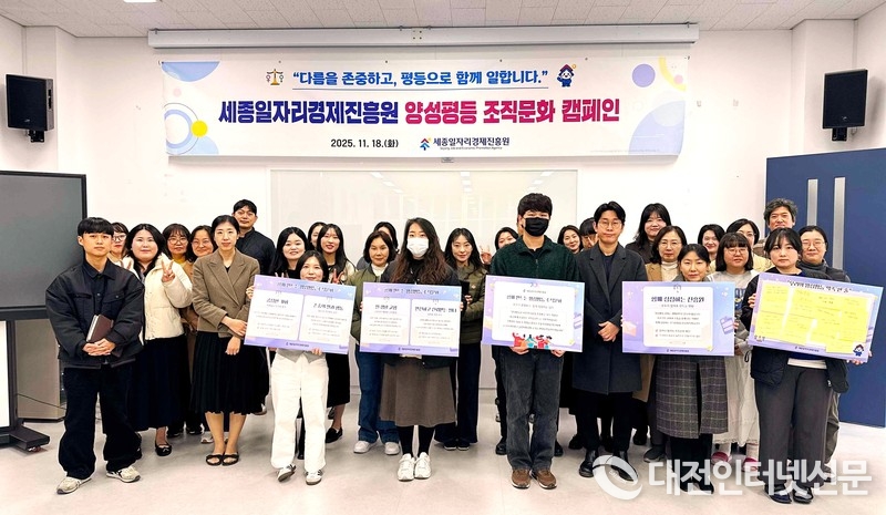 [대전인터넷신문=세종/권혁선 기자] 세종일자리경제진흥원은 18일 본원 교육실에서 임직원과 함께 ‘양성평등 조직문화 캠페인’을 진행하며 성평등 의식 제고와 존중 문화 확산을 위한 다양한 실천 다짐을 공유했다.