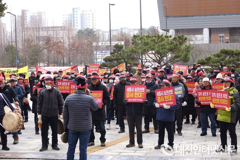 신계룡-북천안 송전선로 건설을 둘러싸고 갈등이 전국으로 확산되는 가운데 세종시 전의·전동·장군면 주민들이 15일 세종시의회 앞에서 송전선로 철회를 촉구하는 모습. [사진-대전인터넷신문]