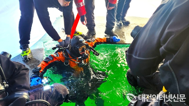 훈련은 얼음 두께 약 50㎝ 이상으로 결빙된 수역에서 진행됐다. 구조대원들은 동력 절단 장비를 활용한 얼음 절단, 얼음 아래 수중 수색, 지상과 수중 간 통신을 활용한 합동 구조 전술을 반복 숙달하며 실제 사고 상황을 가정한 대응 훈련을 수행했다.