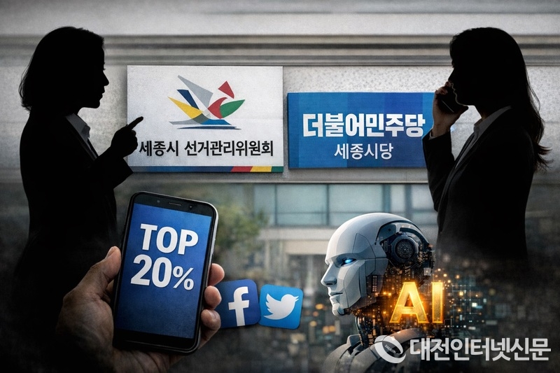 사진은 세종시선거관리위원회와 더불어민주당 세종시당 배경 속에서 SNS ‘상위 20%’ 표시와 AI 이미지가 결합된 합성 사진으로 경선 과정에서 불거진 평가결과 논란과 AI 기반 정치 홍보 문제를 상징적으로 표현한 이미지. [그래픽-대전인터넷신문]
