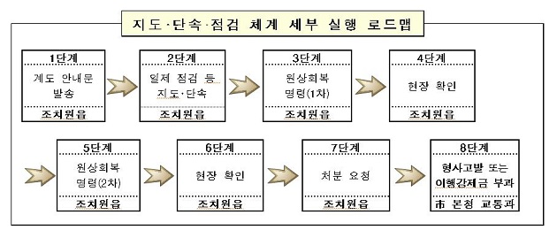 시정촉구에도 불구하고 원상회복이 안 될 경우 3차로`이행강제금´을 부과하고 건물주에게 형사고발 등 강력한 조치가 취해지며 해당건축물은 위반 건축물로 관리된다.