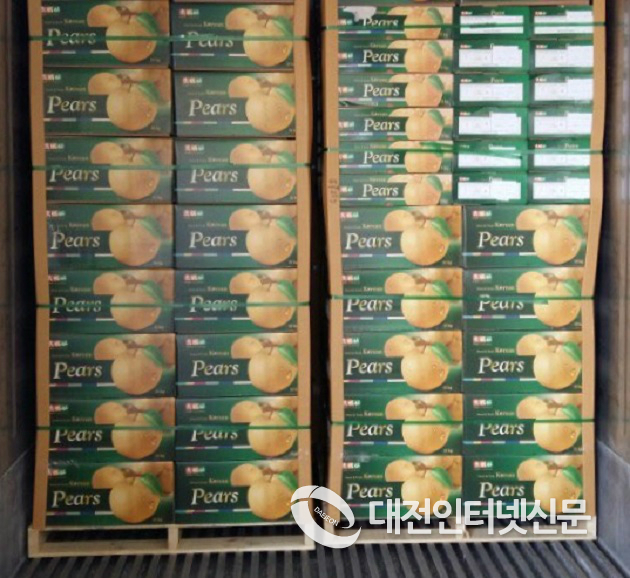 세종특별자치시(시장 이춘희)가 22일 조치원농협과 부용금강배영농조합법인 수출선과장에서 세종 배(원황) 35톤을 대만으로 첫 수출했다.