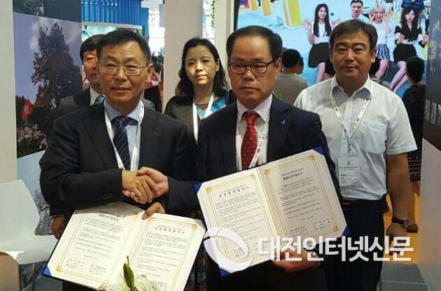 | ▲ 이홍준 세종시 문화체육관광과장(사진 오른쪽)이 27일 실크로드 국제관광박람회 세종시 홍보관에서 양충무 중국 섬서성 여유국장(사진 왼쪽)과 관광분야 우호협력에 관한 MOU를 체결했다. |
