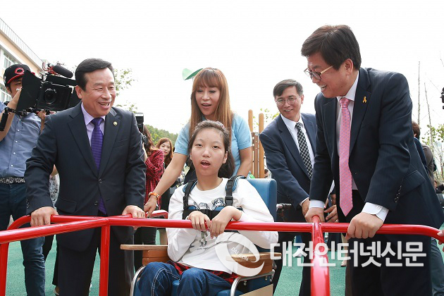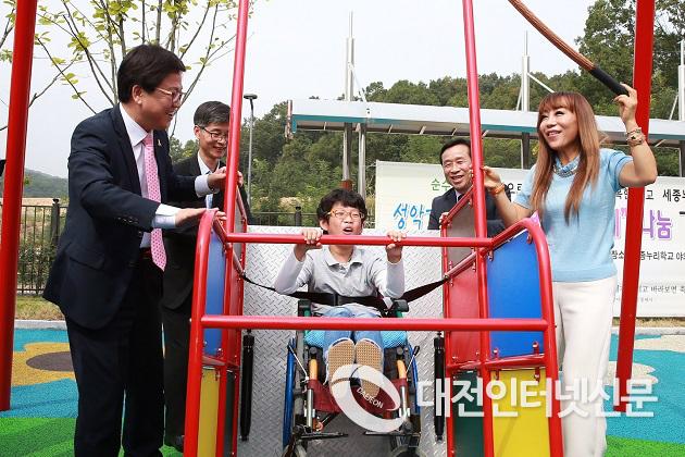 세종특별자치시교육청(교육감 최교진)이 행복도시건설청(청장 이충재), 세종누리학교(교장 정민호)와 성악가 조수미씨의 휠체어 그네 기증 행사를 마련, 장애인을 위한 행복도시 건설과 장애학생을 배려하는 교육실현의 모범적 사례를 선포했다.