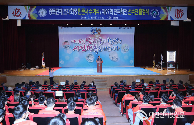 제97회 전국체육대회에 출전하는 대전선수단 9월 30일(금) 오후 3시 시청 대강당에서 출정식을 갖고 장도에 올랐다.